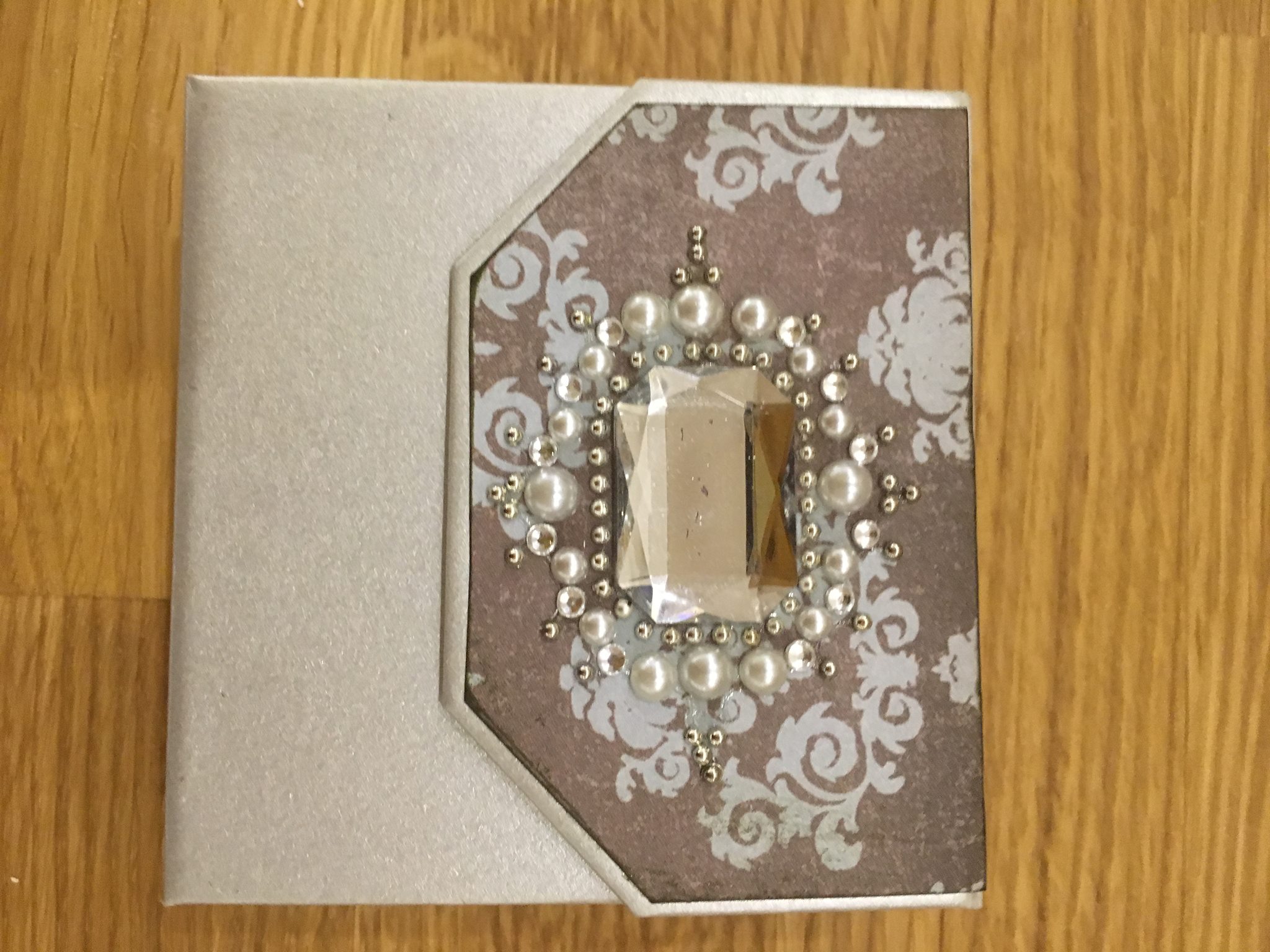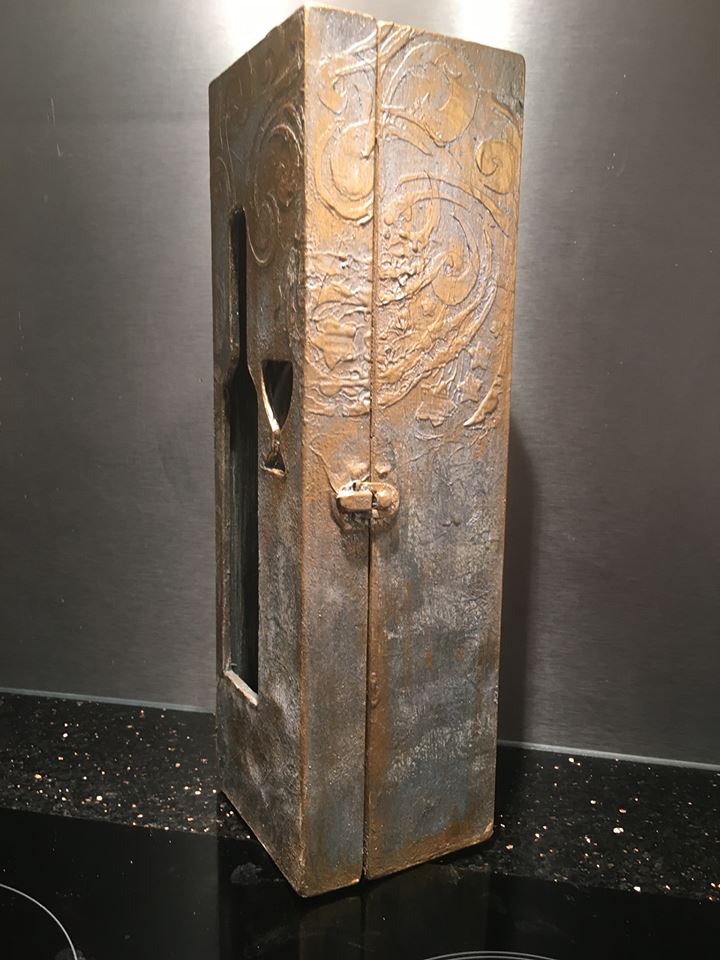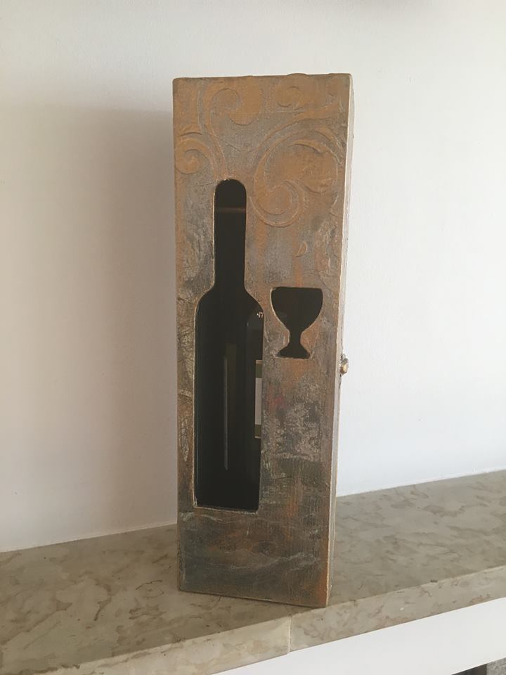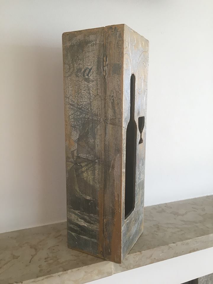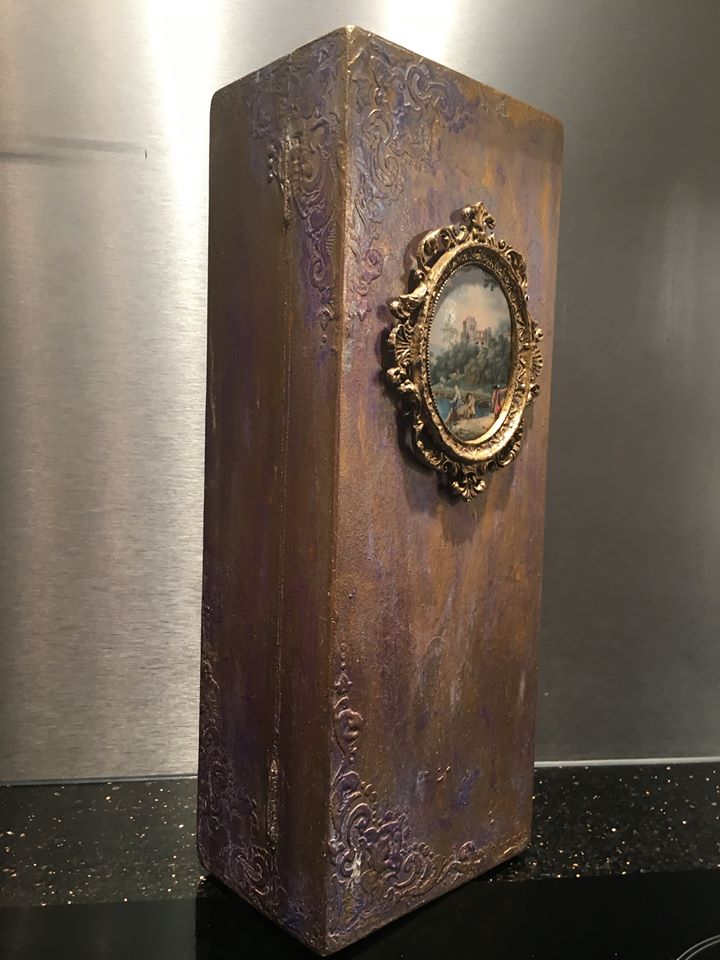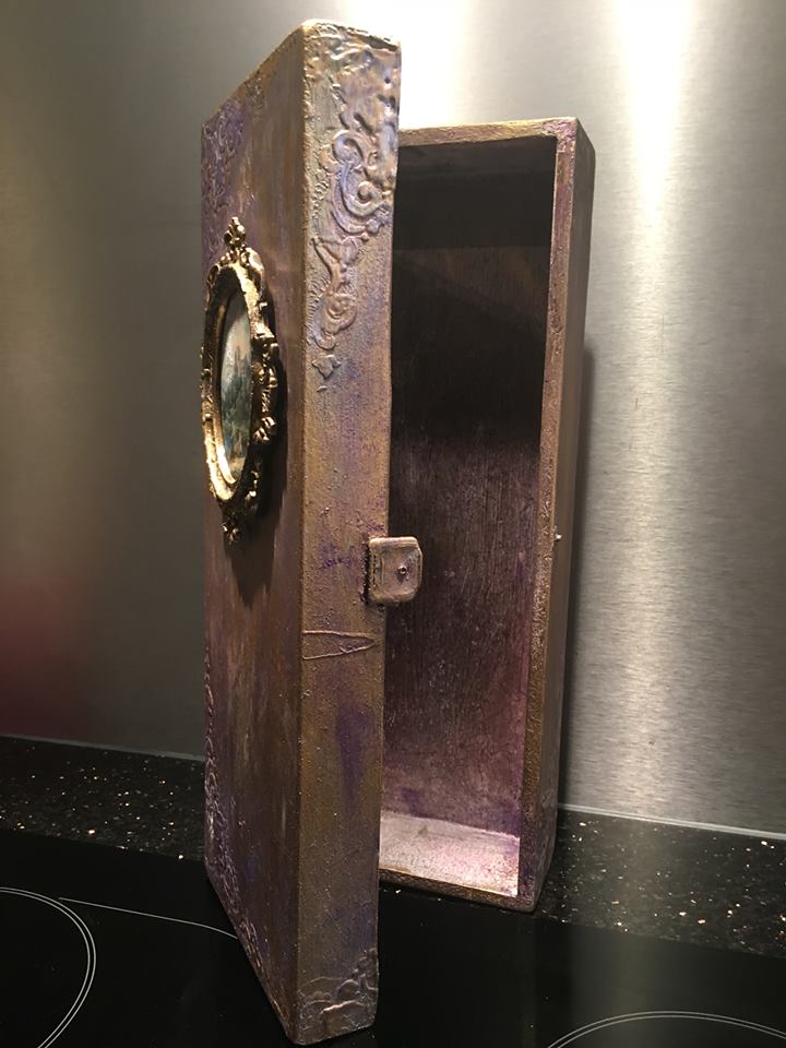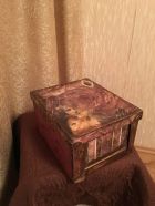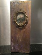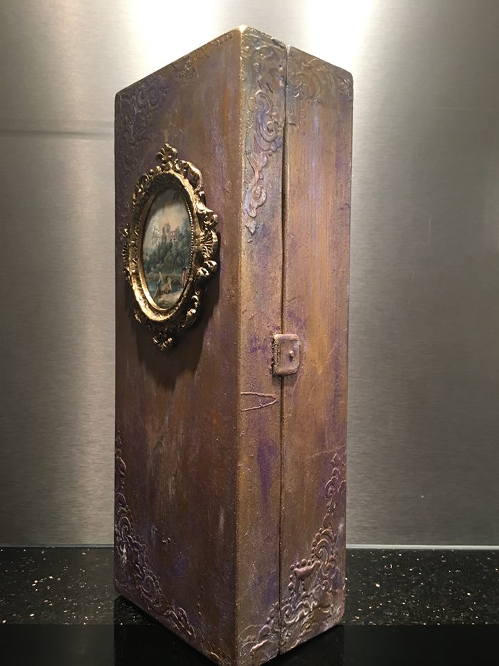 Выполнен из дерева. Передняя панель украшена антикварной миниатюрой в стиле "Пастораль", 19 век. Футляр декорирован в технике микс-медиа. В качестве декора использованы различные пасты, медиумы, лепнина/ гипс, что придает изделию оригинальный вид.