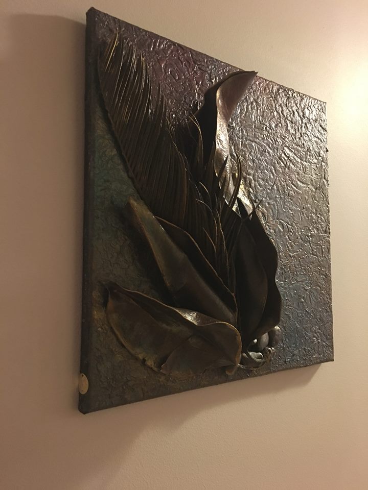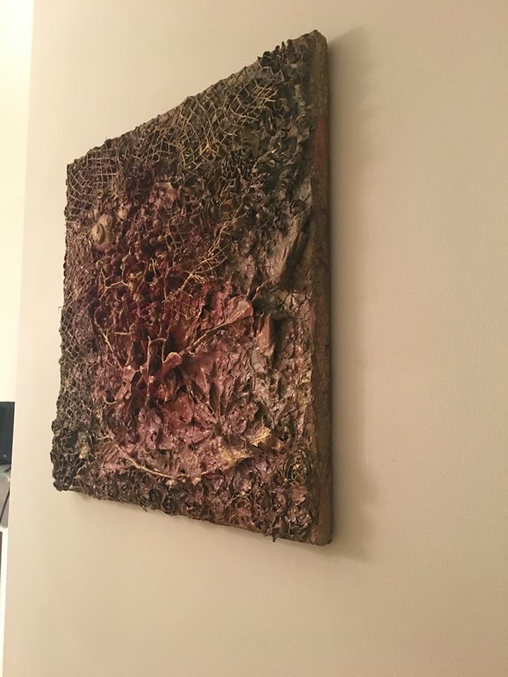 Объемная картина-панно выполнена на холсте в смешанной технике: микс-медиа, эмболяж, терра (использование природных материалов из Эстонии).