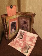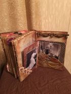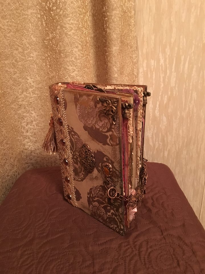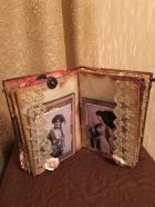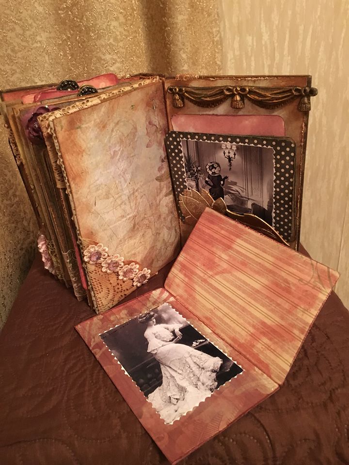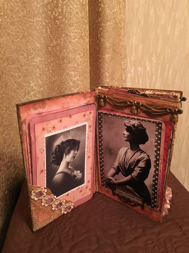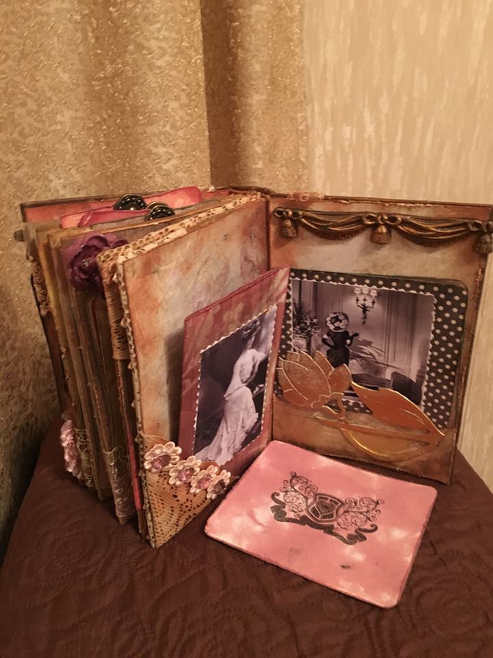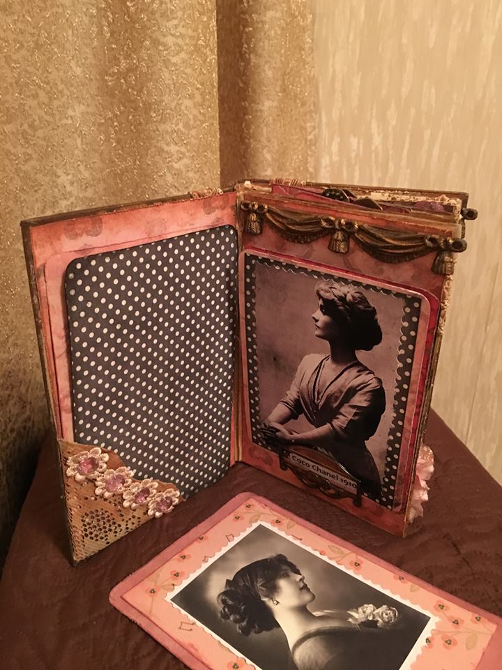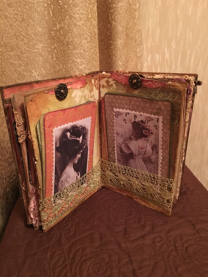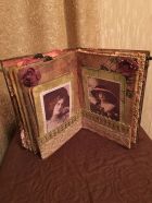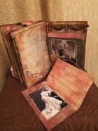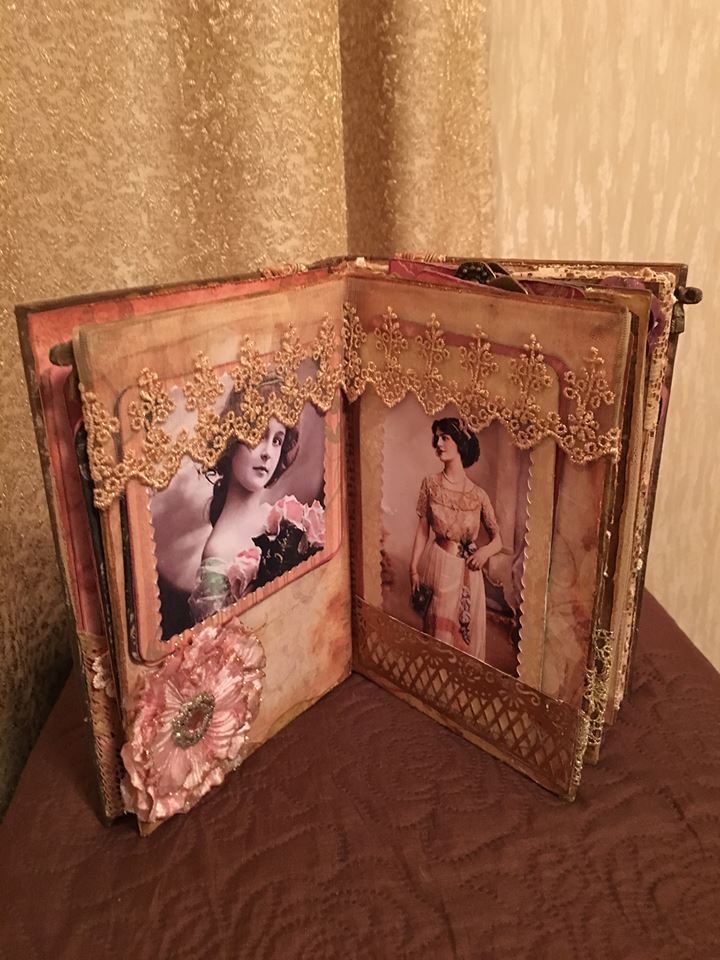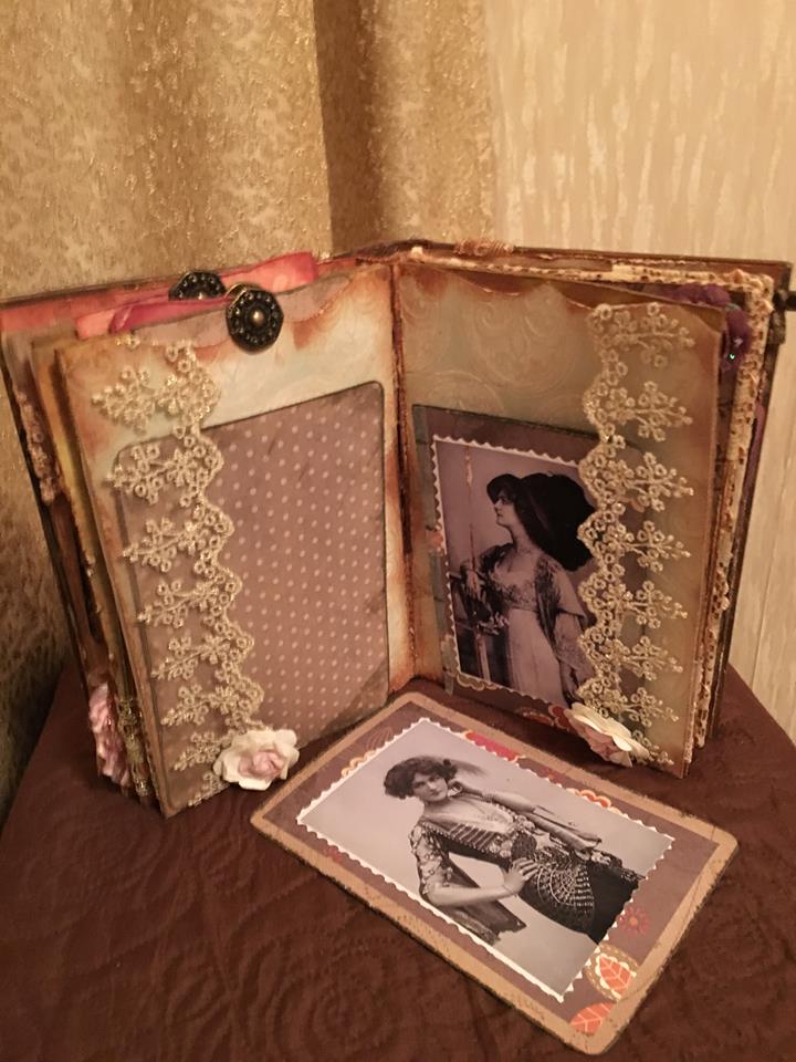 Альбом- книга для фото и записей. Выполнен из винтажной книги 1914 года, в стиле ретро, винтаж, шебби-шик. Снабжен вкладками-карточками для фото, записей и пр. Декорирован дизайнерской бумагой, кружевом, стразами, винтажными цветами ручной работы. Застежка-цепочка в форме бабочек.