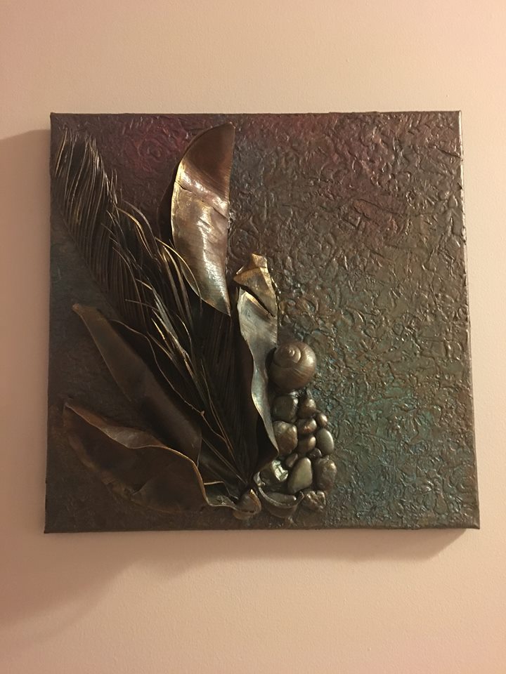 Объемная картина-панно выполнена на холсте в смешанной технике: микс-медиа, эмболяж, терра (использование природных материалов, доставленных с берегов Эгейского моря, о. Родос, Греция).